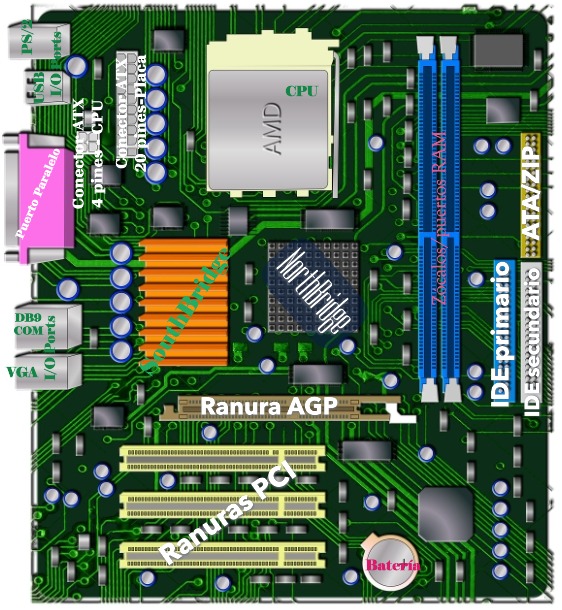 Dada una imagen de la placa base de un ordenador, identifica y etiqueta los siguientes componentes: